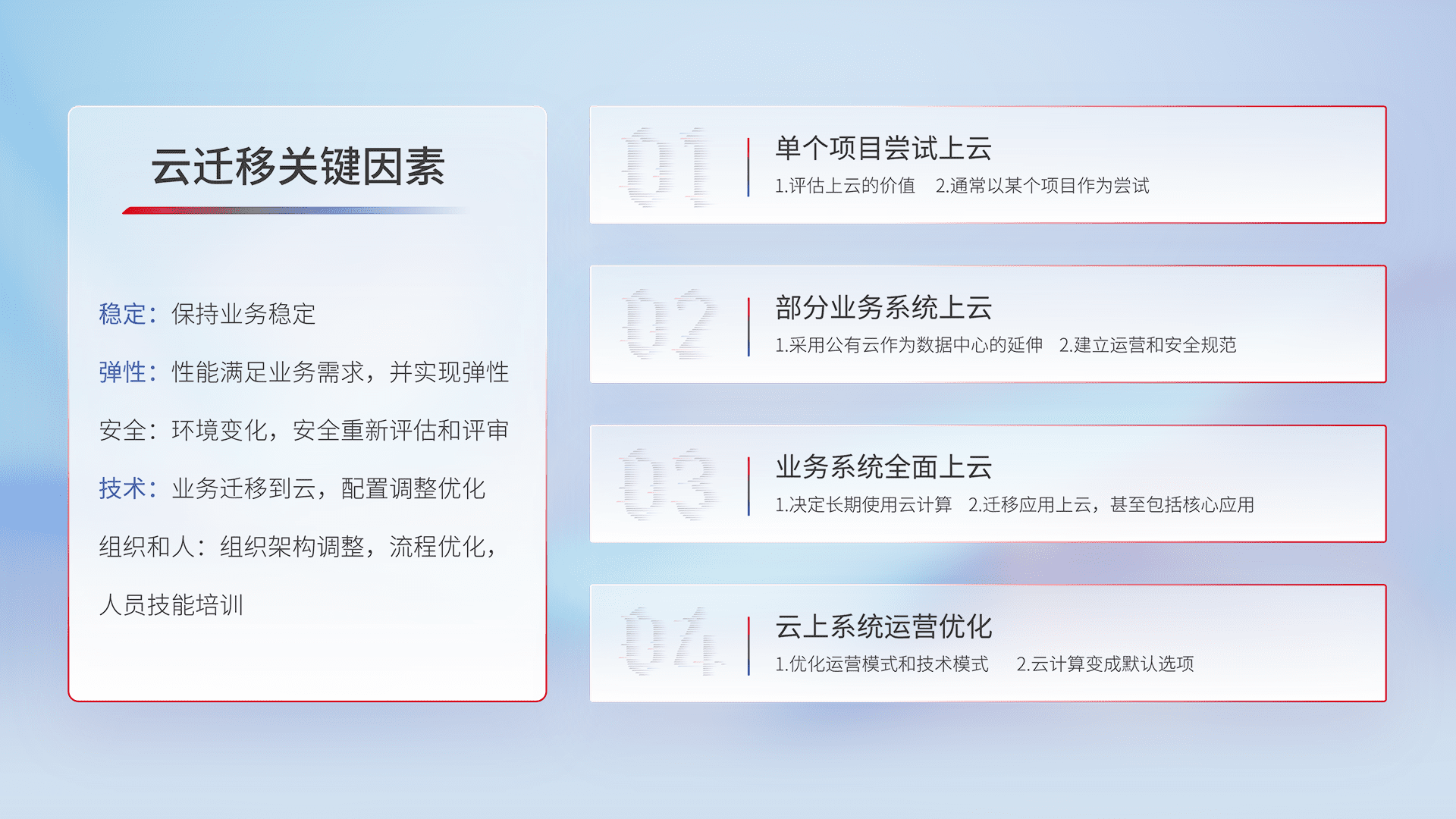 结合实际业务,,,,从规划设计、、、、云平台选型、、、、云原生改造、、数据迁移、、集成交付,,,,迁移全过程为客户识别最佳上云路径,,,做好风险识别管理,,,设计网络架构、、身份权限、、、、安全审计合规、、操作审计、、、、日志审计、、、、监控告警策略、、、多站点容灾设计等,,,对云上基础设施进行整体规划,,,,提升IT治理水平,,,,以满足弹性、、、高可用、、、高性能的需求。。。。