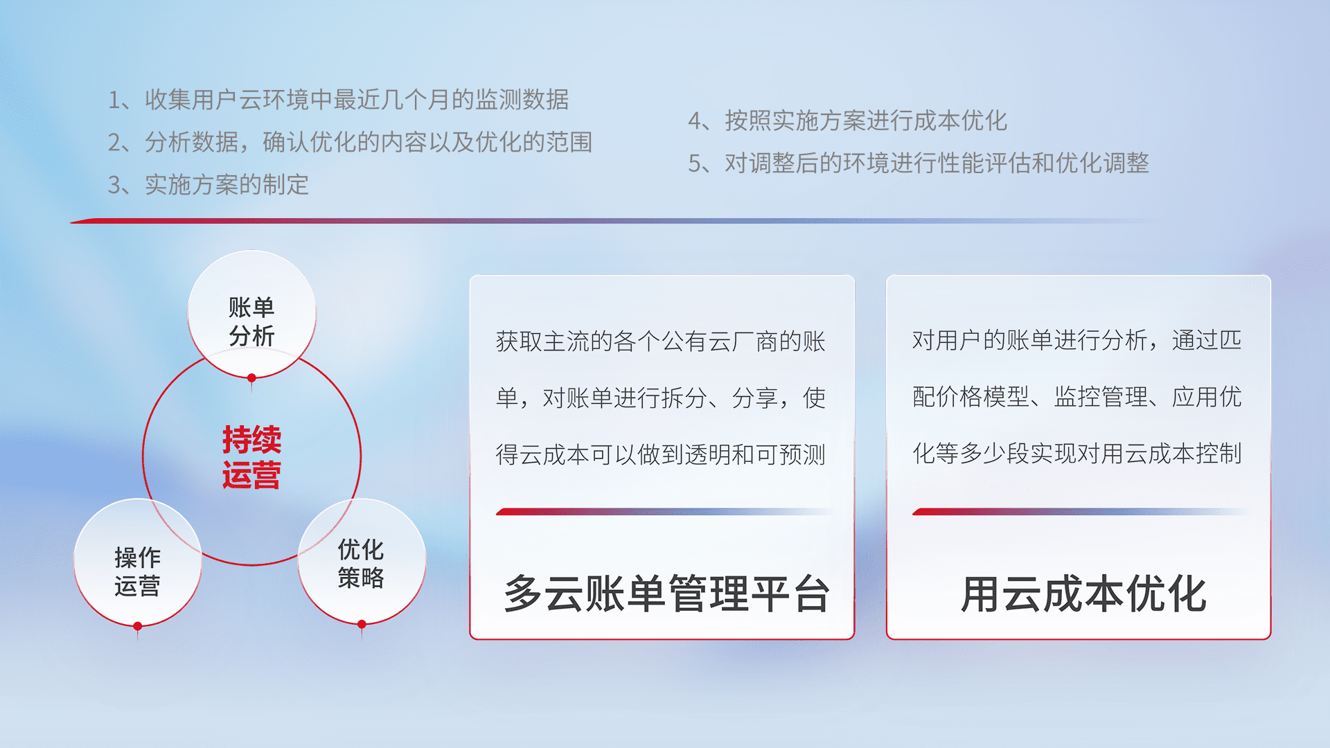 通过多云纳管,,,以统一的资源数据模型把客户的云资源进行抽象和封装,,,进而实现对多云资源的统一操作,,保障云资源管理的可靠性、、、稳定性与可用性。。。量身定制化运维内容,,配置、、开发运维、、补丁管理、、、、备份、、监控、、、认证和访问管理、、、、审计和日常巡检等,,保障在用云过程中的可靠度,,,,稳定度以及高可用率。。。